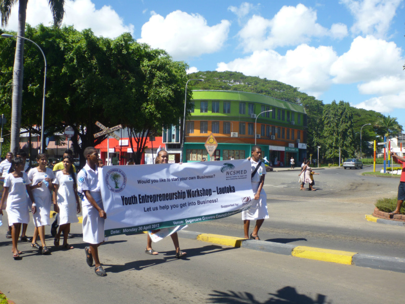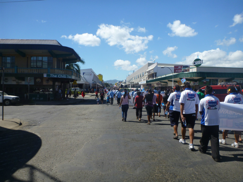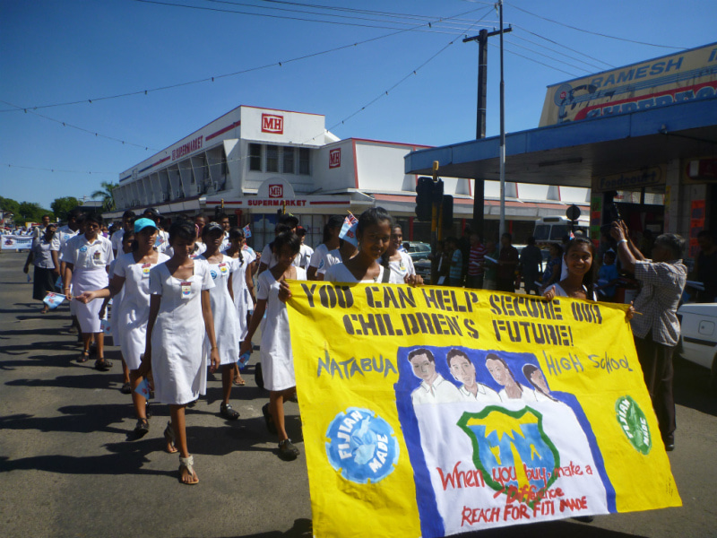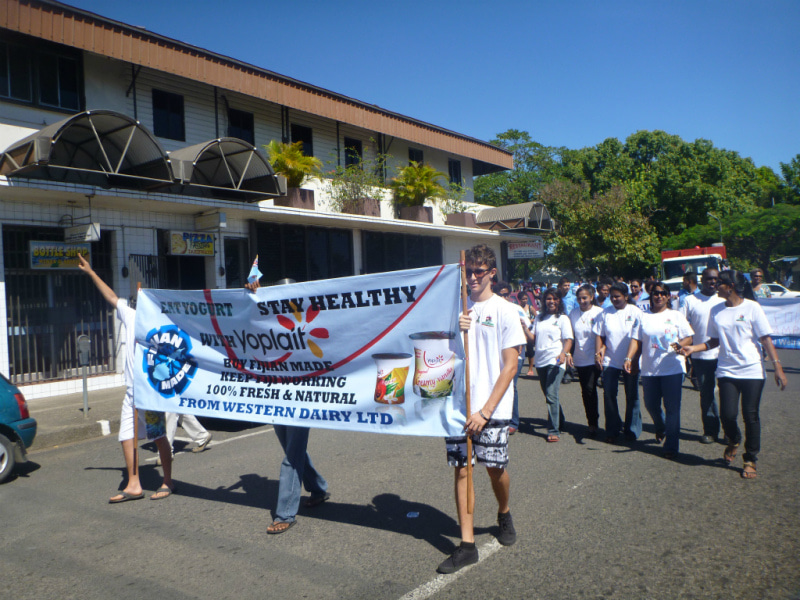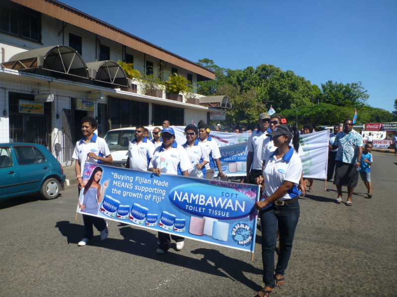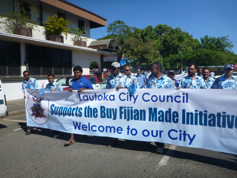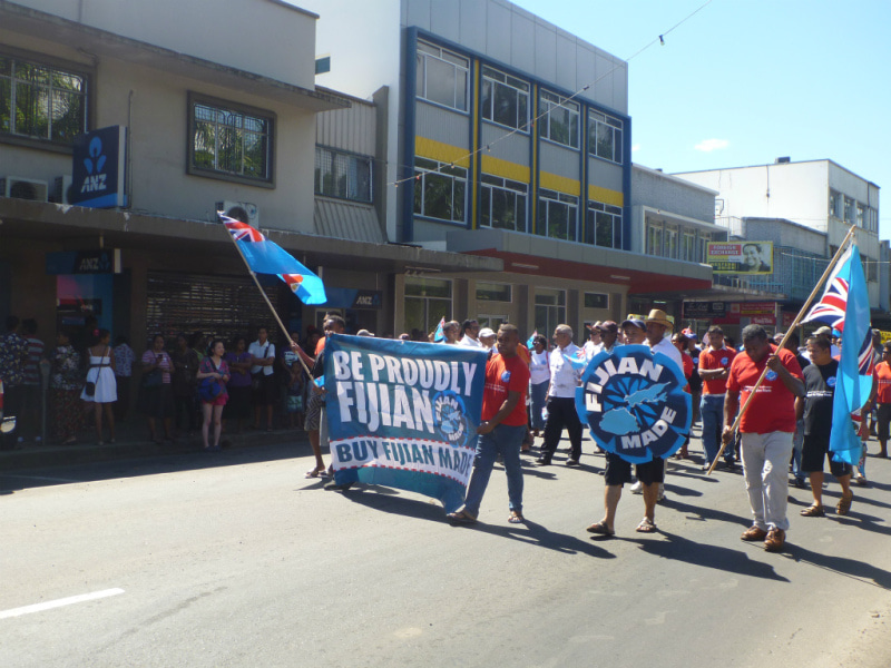 Fijian Made キャンペーンの旗を先頭に、マーチングを開始します。